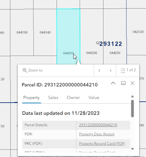 2.Start typing your search term into the search box. As you enter the Parcel ID Number, Owner's name, or Property Location Address the auto-complete feature will begin displaying results (results are limited to a maximum of 10 rows). The results will be reduced as you continue to enter characters into the search. You can also interact directly with the map by clicking or tapping on a parcel to get information.